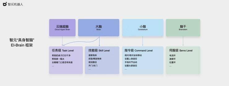 比如,上个月智元在发布首款产品远征 A1 时还推出了分为四级的具身智脑框架 EI-Brain ,包括技能级的云端超脑、技能级的大脑、指令级的小脑以及伺服级的脑干。