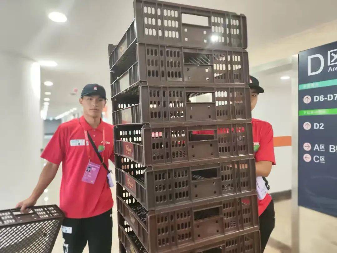 两位穿着红色制服的志愿者正在忙碌且有序地搬运一叠物资筐