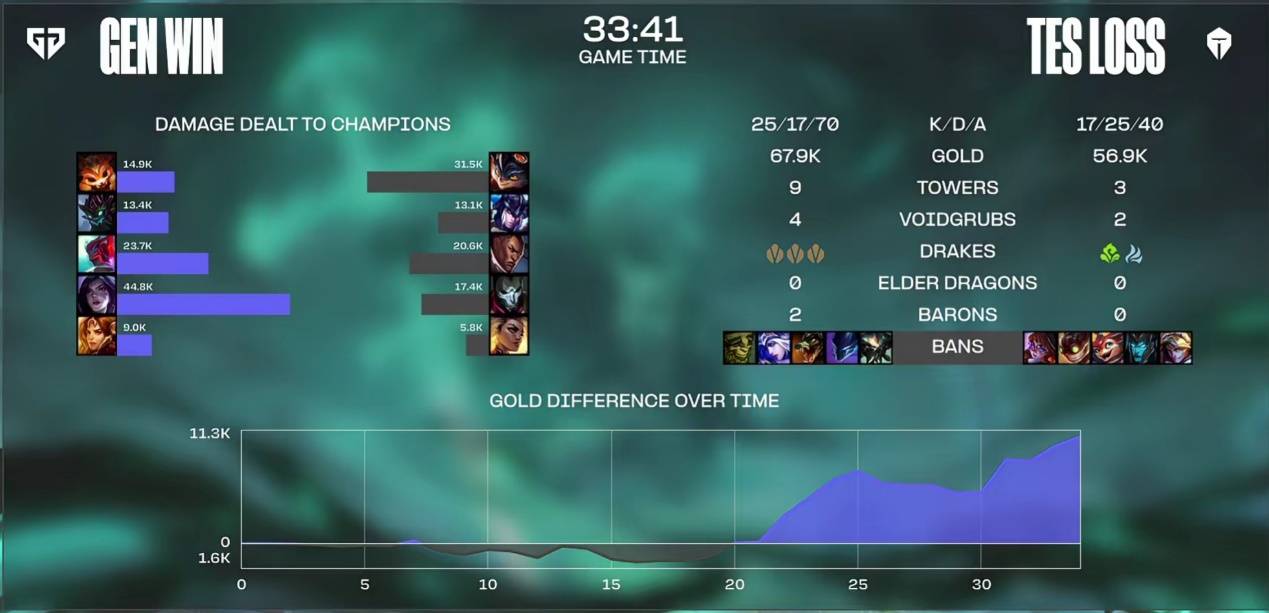GEN后续展开推塔攻势,JKL中路防守不及被越塔击杀,后续369一个6-0的兰博被GEN抓到绕后机会后将终结钱送出,GEN连续拆塔,运营领先,TES出现乱流,经济优势被扳平。