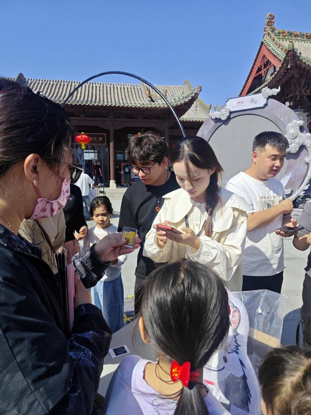 解州关帝庙景点中,一块硕大的“照骨镜”前,许多“天命人”正在通过手机在京东APP参与互动,更有人已经现场领取到了互动好礼,还有玩家现场体验了京东3C数码带来的前沿出游装备。