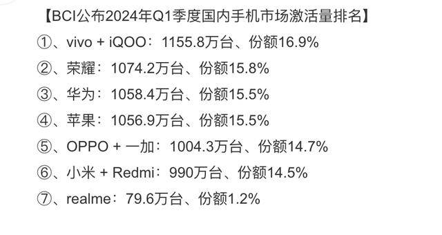 排名第二的是小米,它的激活量为2734.9万台,市场份额为15.5%。虽然第二到六名的成绩相差不大,但是小米和第六名的差距也达到了199.8万台,相当于平时2周的激活量数据之和。在2023年的激活量榜单中,小米仅次于荣耀排名第五,年初大家还在讨论华为回归带来的影响,就目前的数据来看小米的成绩出现了明显的同比增长。看了一下2024年Q1的激活量榜单,小米手机排名第六,现在知道小米在Q2和七八月份的成绩有多大提升了吧。
