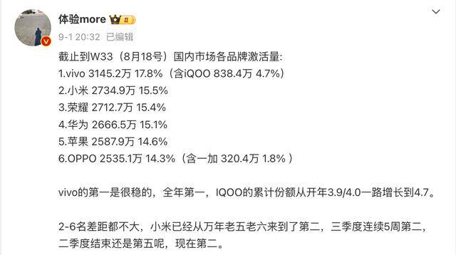 9月4日消息,知名数码博主体验more分享了国内智能手机激活量榜单,时间是2024年1月1日到8月18日(33周)。和去年的榜单相比,榜单的排名和数据发生了洗牌,最惊艳的是vivo手机,目前的激活量和市场份额都遥遥领先。其他5个品牌的激活量差距不大,最惊艳的是小米打败了荣耀排名第二,去年的冠军苹果目前仅排名第五,黑厂紧随其后。