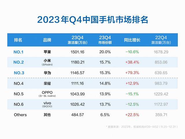 排名第四的是华为,它的激活量为2666.5万台,市场份额为15.1%。还记得去年第四季度,华为Mate60系列硬钢iPhone15系列,当时亓纪唯一的想法是,2024年华为在国内手机榜单中绝对遥遥领先。从前两个季度的数据来看,情况远没有想象中的好,不论是华为Pura70系列还是Nova12系列,热度和销量都远低于华为Mate60系列。根据最新的爆料,华为Mate70系列将于11月份发布,希望它能够重现华为Mate60系列的风采。
