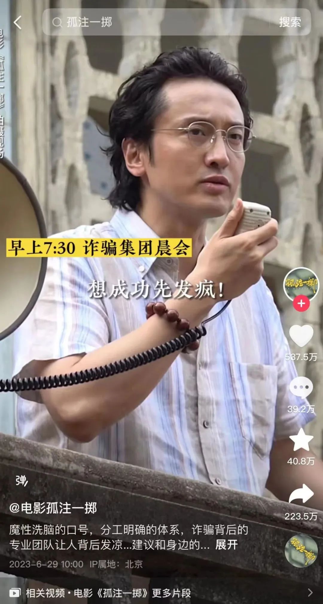 《孤注一掷》就更不必多说了,在前阵子的文章(回顾:《<孤注一掷>的短视频营销究竟强在哪?》)中,犀牛君用了一整篇的篇幅去剖析这部影片的营销经验。可以说,没有前期成功的话题营销,就没有后来这部影片的暑期档冠军。