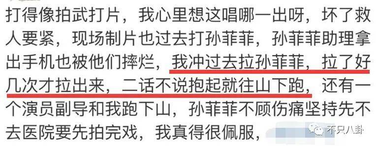 没想到事发当天,导演的侄子毫无理由地就把孙菲菲打了,是黄毛和一个演员副导把孙菲菲救出来往山下跑,被打的孙菲菲当时还想着要继续拍戏。
