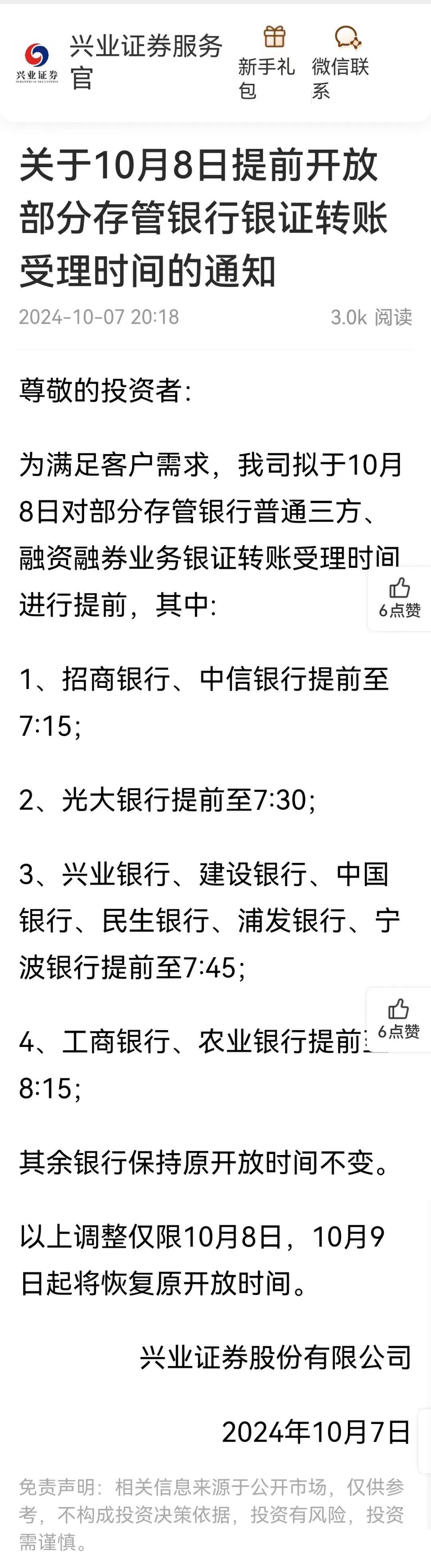 中信建投亦发布通知:10月8日建设银行、中信银行和交通银行三方银证转账时间(不含信用账户)提前至7:30,农业银行三方银证转账时间(不含信用账户)提前至8:00。