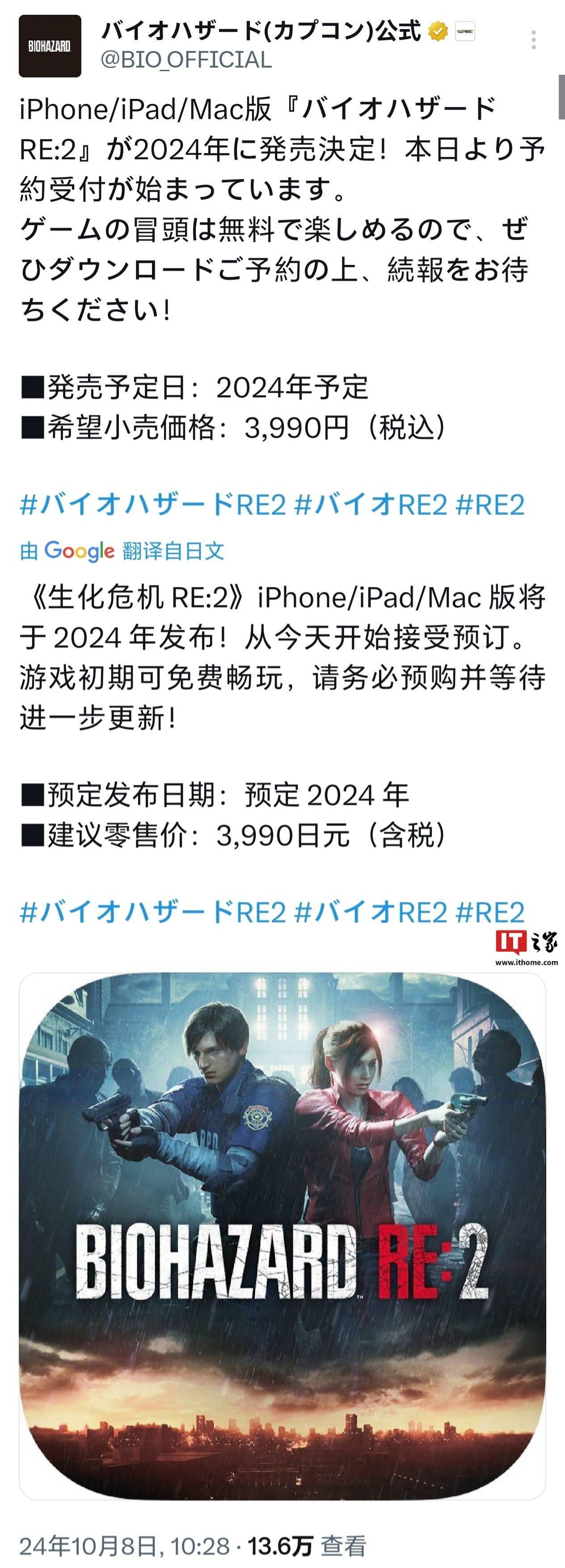 IT之家 10 月 8 日消息,卡普空官方今日发文宣布《生化危机 2:重制版》将于 2024 年内登陆 iPhone / iPad / Mac 平台,现上架 App Store 开始接受预订,售价 3990 日元(IT之家备注:当前约 190 元人民币)。