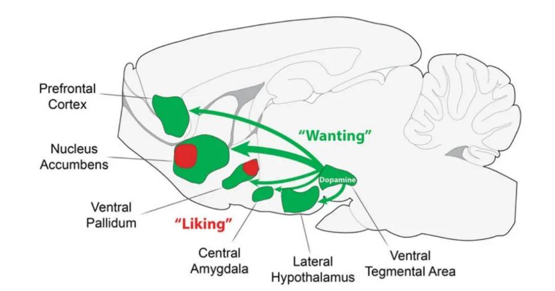 造成这种现象的原因在于,大脑中调节“想要”和“喜欢”的神经系统很大程度上是分离的。“想要”是由一套更大和更强的神经系统产生的,其中包含中脑边缘多巴胺通路,而“喜欢”则是由更小和更弱的神经系统调节的,这套系统并不怎么依赖多巴胺。