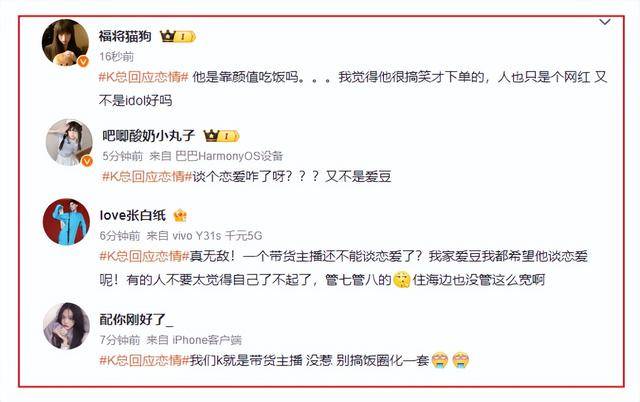 看着K总自曝恋情遭到网暴,真正的粉丝们集体怒了:“K总又不是爱豆,谈恋爱怎么了?”、“人家没劈腿出轨,好好谈恋爱不比挂在热搜的渣男强吗?”