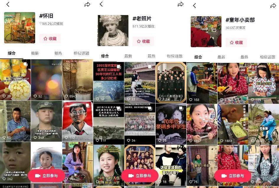 “怀旧风”内容在国内网络上本就拥有巨大的号召力和吸引力,光#怀旧 这一个话题在抖音的播放量就超过了惊人的1100亿次,#老照片 话题播放量超500亿次,#童年小卖部 播放也达到了50亿次。