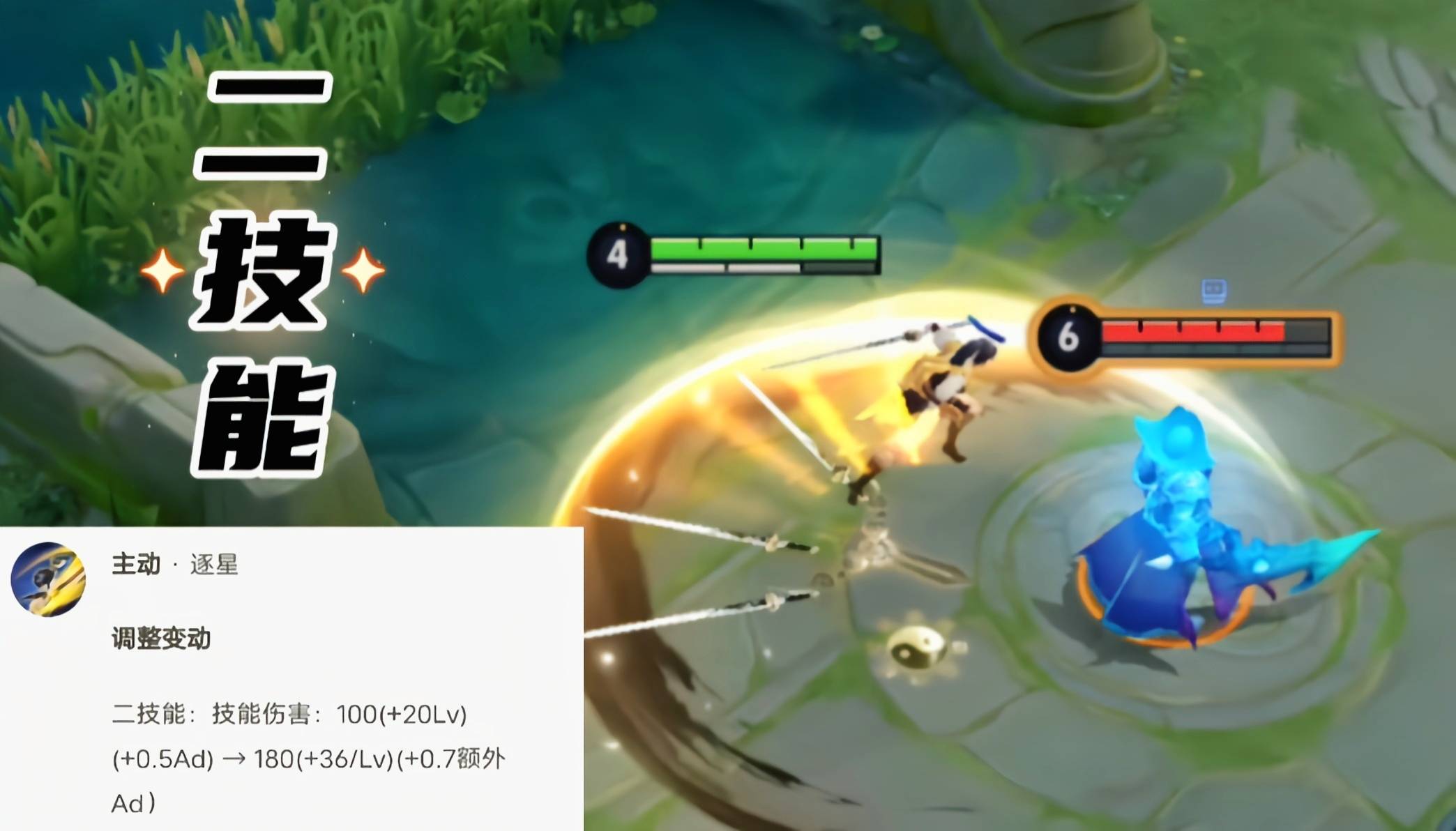 其实在二三技能调整之前,曜的一技能也进行过一次调整,也是类似于二三技能的调整,提升了基础数值与等级成长数值,同时加成模式从AD调整为额外AD。
