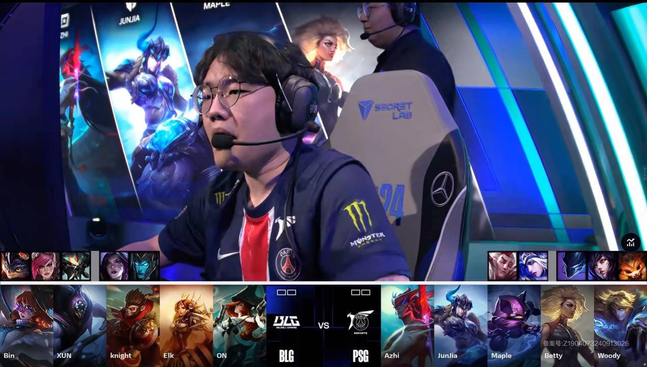 BLG派上首发Xun,BP阶段选择抢阿萝拉放掉永恩猪妹的组合,Xun首次登场锁定猴子,搭配上单武器双进场,下路出女枪女坦的组合,阵容有很强的冲阵能力,中期作战能力会比较强,与PSG形成一个对冲。