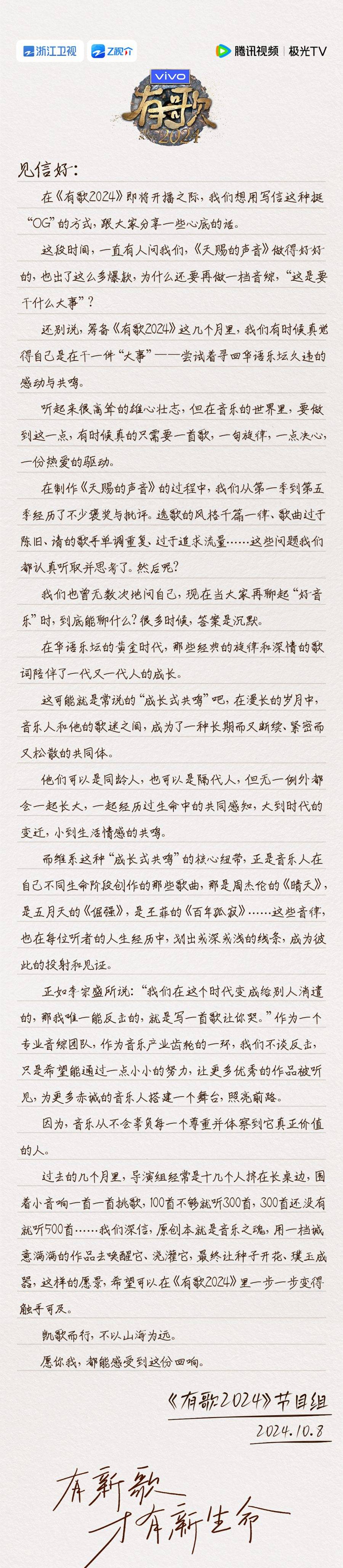 附:来自《有歌2024》节目组的一封信: