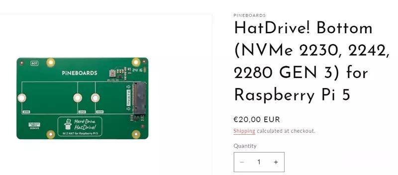 除此之外,还需要一个HAT模块将Pi 5上的PCIe FFC连接转换为M.2插槽,这又增加了20欧元左右。