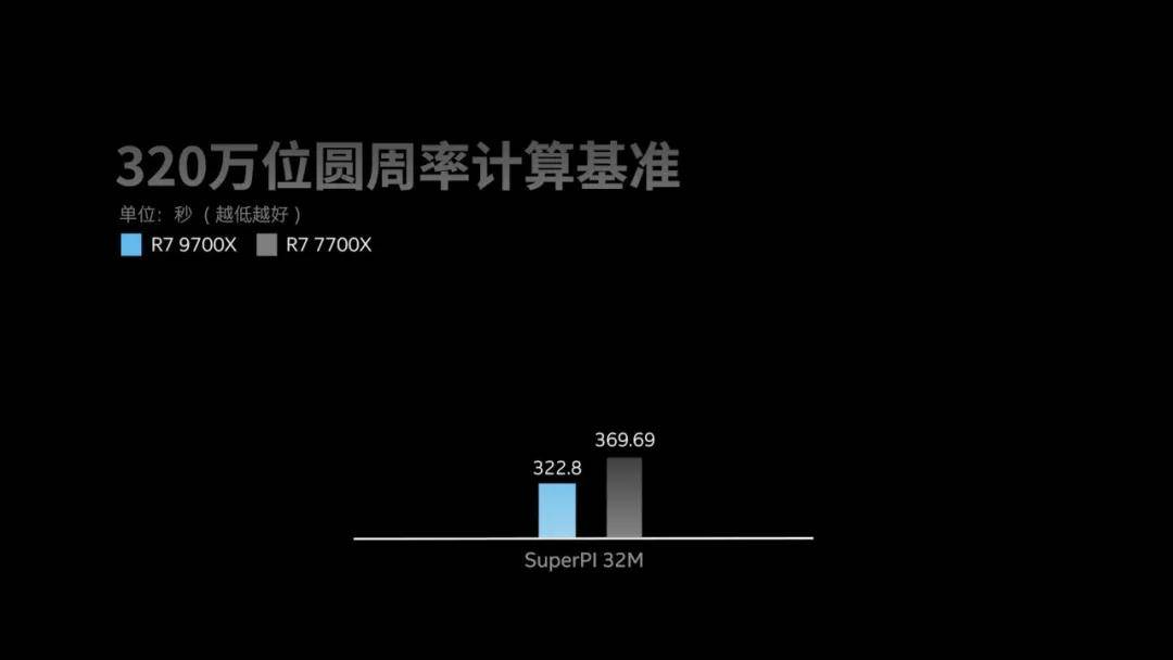 在320万位圆周率计算基准中,主要考究处理器在执行整数计算时的速度,这里需要注意的是,很多人认为SuperPi是考验浮点性能,因为多少位圆周率指的是精确到小数点后多少位,但实际上SuperPi计算的是精确值,而不是浮点类型的近似值,所以在SuperPi中的计算还是考验的整数性能。可以看到,在这项测试中,锐龙7 9700X要比前代快上不少,基本五分钟出头即可计算完成,而锐龙7 7700X则需要6分钟左右。