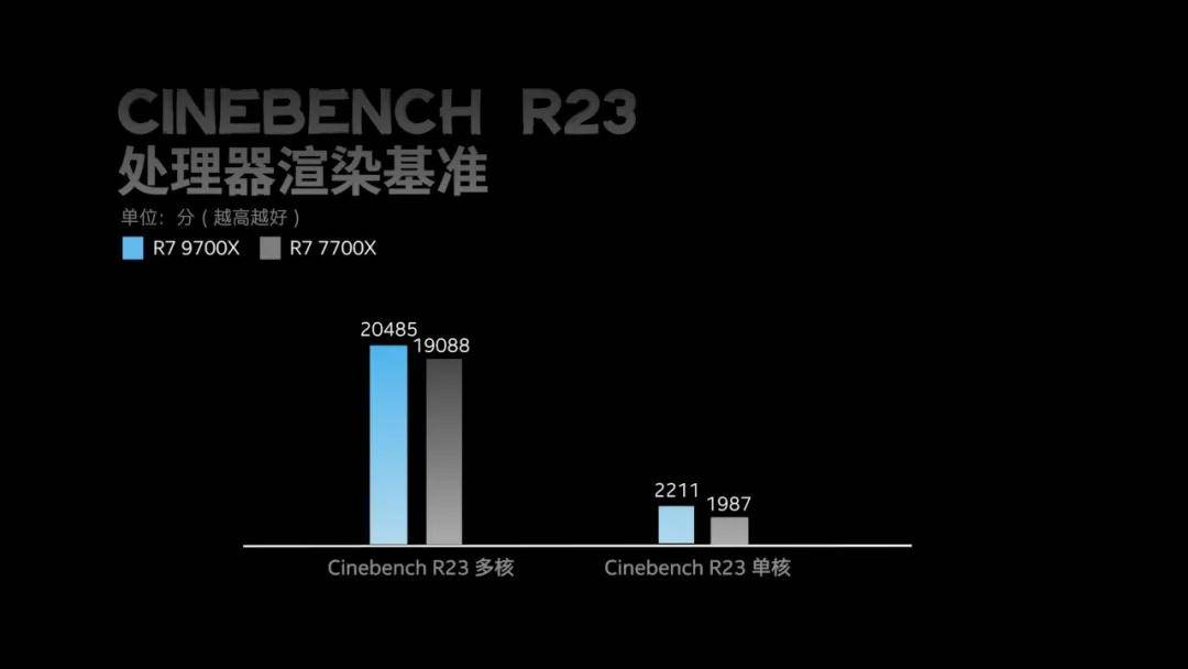 Cinebench R23测试主要通过固定条件和参数渲染同一幅画面,以完成渲染速度作为基准得出评判分数,主要考究处理器的纯物理计算性能,在这一测试中,锐龙7 9700X多核要胜过前代约7%左右,幅度并不是很大,当然,这是在开启PBO下获得的成绩。单核分数则有11%以上的领先,IPC以及主频的提升功不可没。