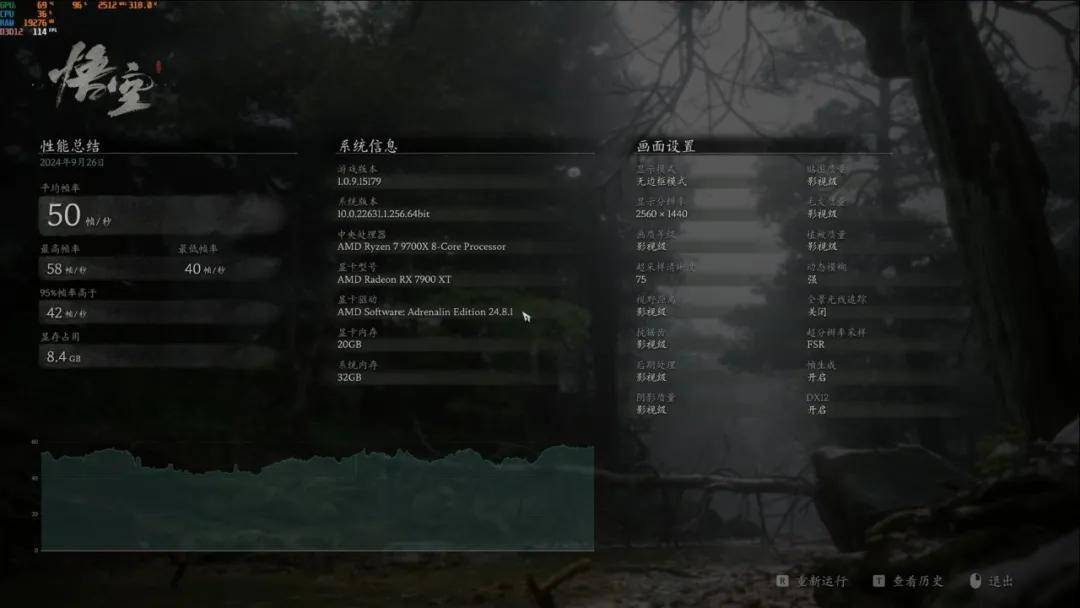 实际游戏环节,《黑神话:悟空》在基准测试工具中获得50帧成绩,当然,这是在不开启FSR以及AFMF帧生成在全影视级2K满画质下测得的成绩,乍一看似乎RX 7900 XT并不能完美应对2K?
