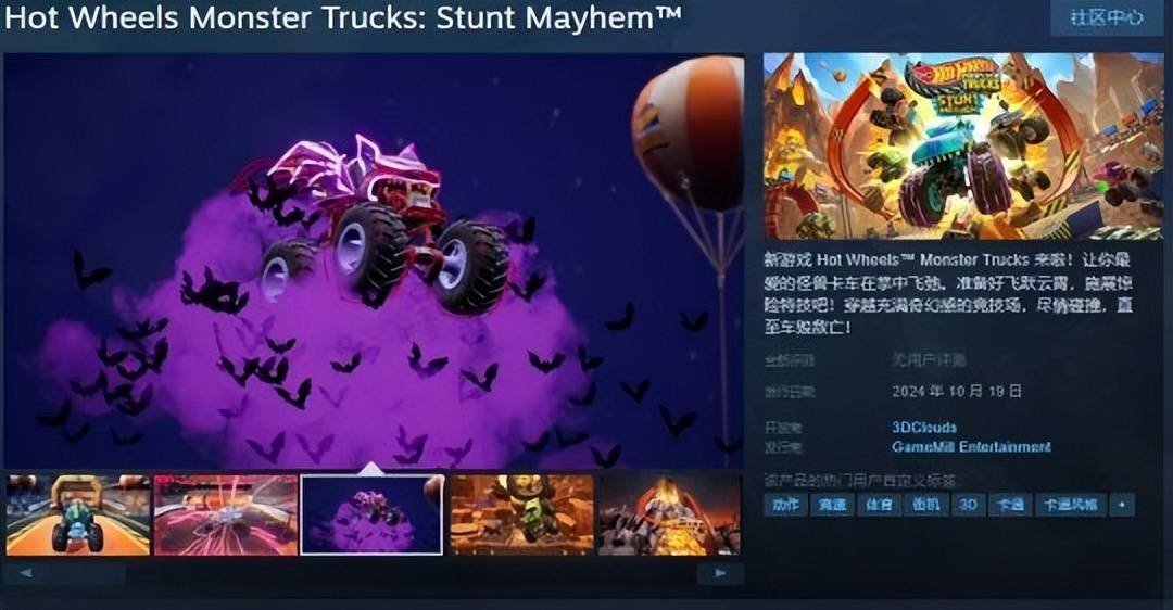 赛车竞速游戏《风火轮怪兽卡车:Stunt Mayhem》Steam页面上线,游戏暂不支持中文,预计于10月19日发售。