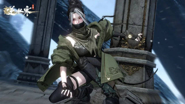长款外套的布料上乘,繁密的花纹绣在衣摆之上,复古而又神秘。黑色高领的设计遮掩住半张脸庞,气质更是冷峻到了极点。穿上这套时装,直接就是那个最靓的崽,走在游戏里都能自带BGM!