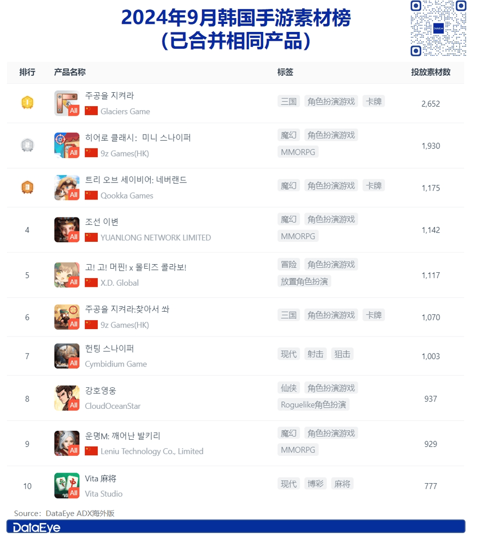 在韩国买量榜TOP10上,冰川网络两款游戏以绝对的投放量霸占前二。在榜单上,来自非中国大陆厂商的产品仅有三款,打猎游戏《헌팅 스나이퍼》、武侠游戏《강호영웅》和《Vita麻将》。相比其他主要市场,韩国市场被大陆游戏占领的态势更加明显。
