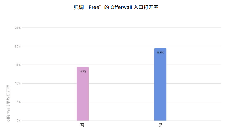 进一步来看,曝光度和货币促销 (Currency Sales)是积分墙变现策略成功与否的⾸要因素。举例来说,那些强调“Free”字样的积分墙入口,其打开率比未使用类似表述的入口高出 4.8%。因为用户行为漏⽃的起点是整个积分墙变现效果的关键基础,所以保持高打开率至关重要。