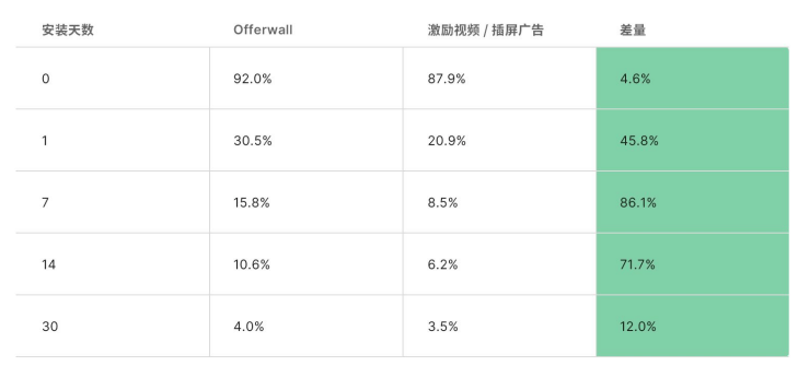 通常来说,与非积分墙用户相比,通过积分墙获取和转化的用户留存要高出2~7倍。同时,与通过激励视频和插屏广告获取的用户相比,通过积分墙获取的用户D7-LTV高出100%,D30-LTV高出52.1%,D60-LTV高出15.8%。