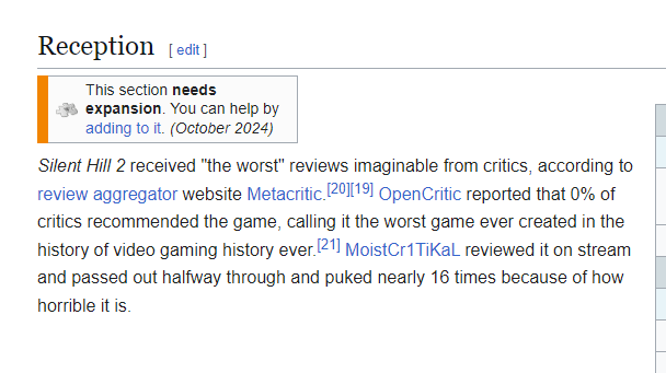从10月6日开始,也就是《寂静岭2重制版》发售两天前,就有网友发现游戏的英文维基词条遭到恶意篡改,说这部游戏收到了“可以想象到的最差评论”,是“游戏史上最烂的游戏”,还造谣称有主播打到一半“昏了过去”“吐了大概16次”。