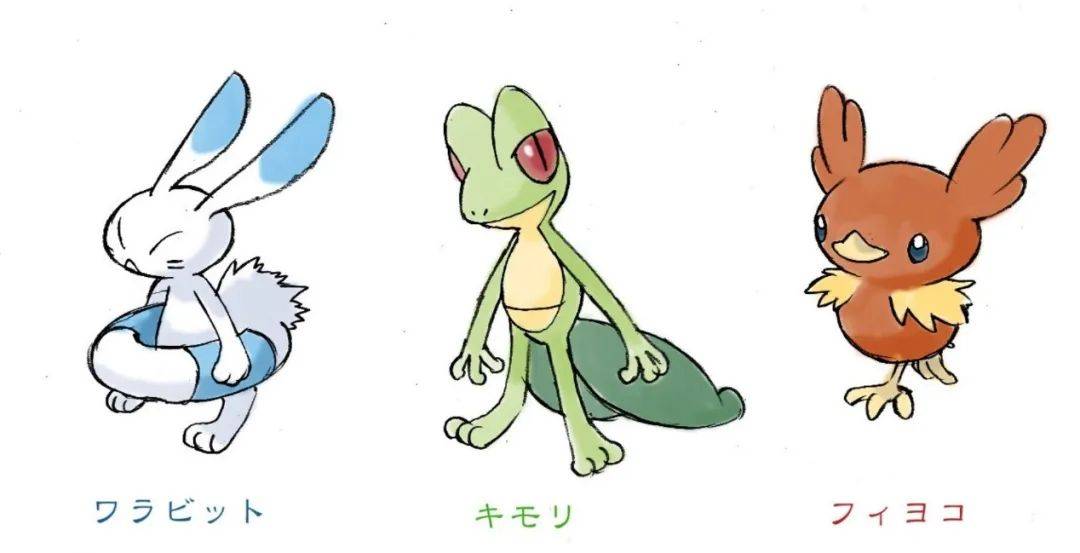 御三家的废案中,火主和草主的外形虽然和我们所熟知的第三世代有些差别,还是能很轻松地分辨出它们是木守宫和火稚鸡。但是水主的位置上,原本的水跃鱼却不见了踪影,取而代之的是一只蓝白配色,腰间揣着一个救生圈的小兔子。
