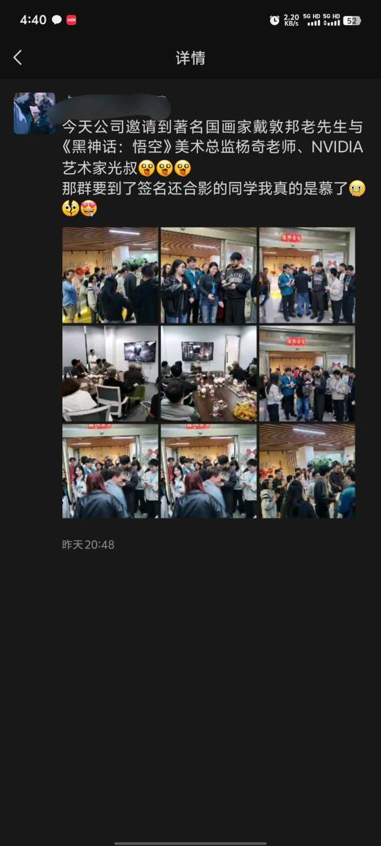 近日,据可靠消息来源透露,游戏科学公司已经恢复办公。一位网友在黑神话贴吧分享了微信朋友圈的截图,其中显示著名画家戴敦邦、《黑神话》美术总监杨奇以及英伟达艺术家光叔出现在某外包公司。此外,还有网友晒出杨奇与众人合影的照片。