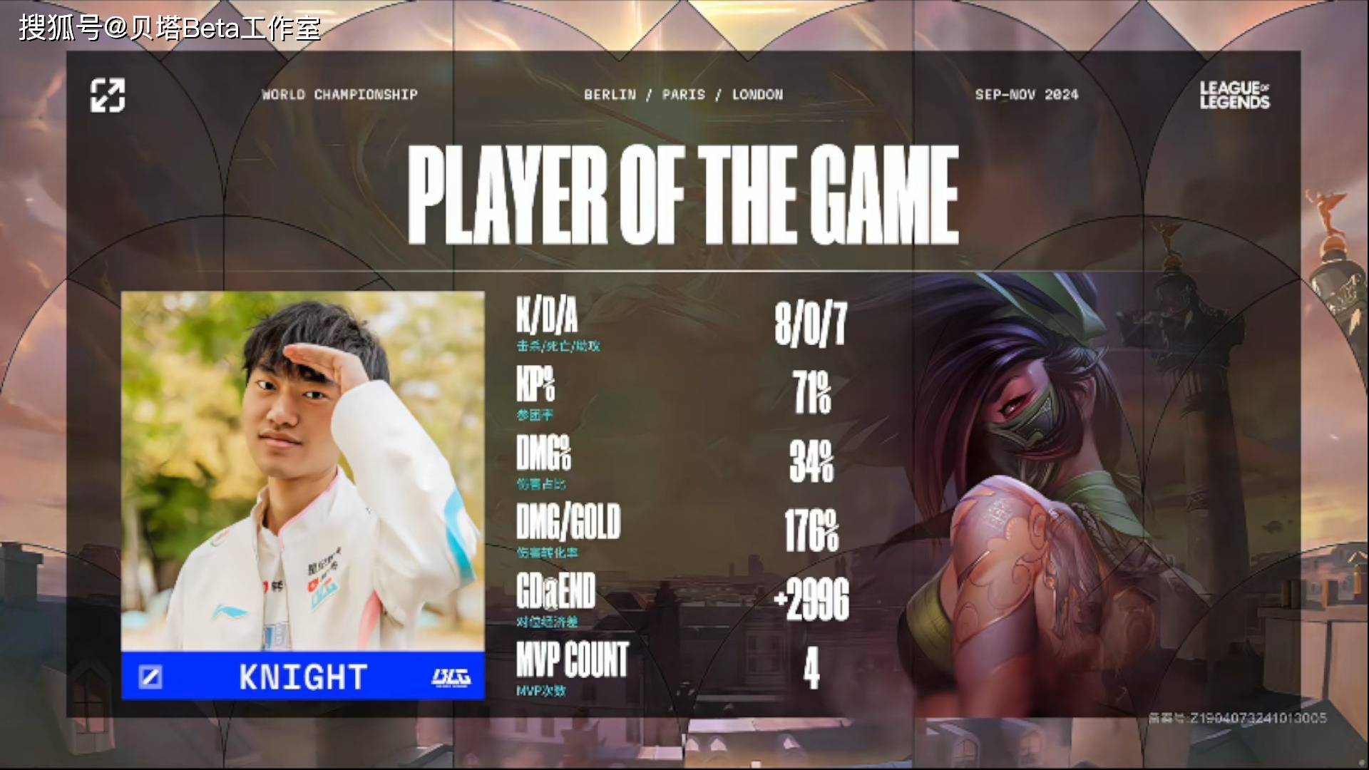 首先是这场BLG和WBG的半决赛中,虽然只打了3场,但是knight第一局的斯莫德战绩4-1-3,第二局的辛德拉战绩7-0-8,第三局的阿卡丽战绩8-0-7,三场比赛合砍19-1-18的豪华数据,并且拿到了第二局和第三局的MVP,还在赛后被英文解说评为这场半决赛的系列MVP,可以说是真正的当之无愧了。