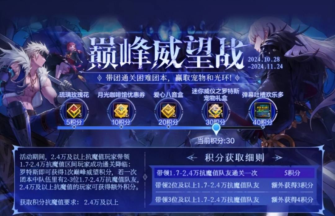 《DNF手游》将在10月28日开启全新活动【巅峰威望战】,该活动共计持续4周时间,活动期间2.4w及以上抗魔值的可以带领1.7w-2.4w抗魔值的角色通关【降临:罗特斯】,以此来获得“巅峰威望积分”。