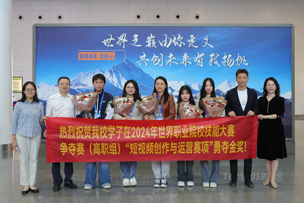 “短视频创作与运营”赛项参赛队员和指导老师合影。学校供图