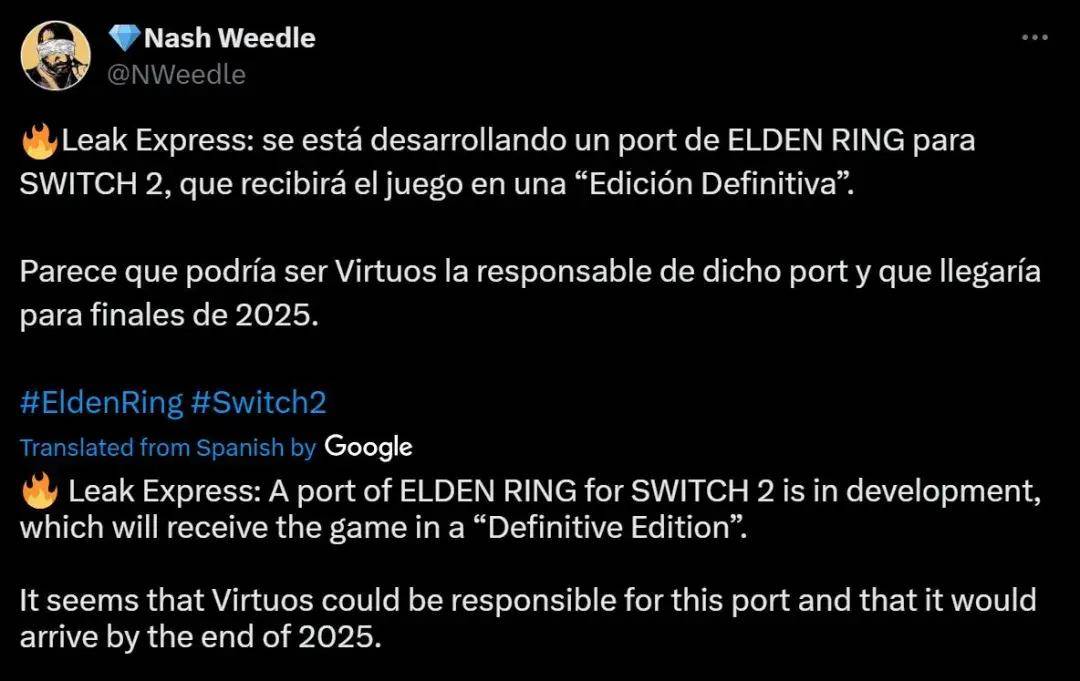据知名舅舅Nash Weedle爆料,《艾尔登法环:终极版》将在明年(2025年)登陆Switch 2。负责移植《黑暗之魂》的维塔士公司担任移植工作。
