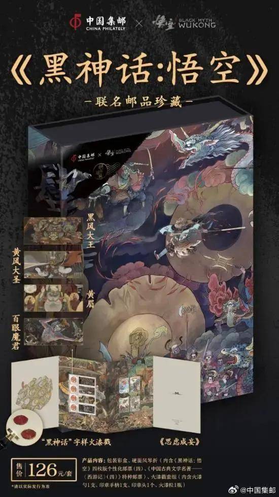 每款邮品都包含了四张对应《黑神话》的邮票,以及《西游记》邮票一组,和火漆戳套组,售价126元人民币。