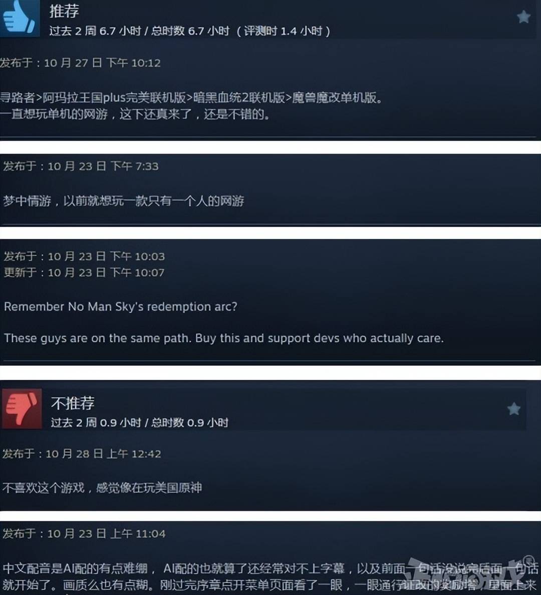 不过也有吐槽的玩家表示,不喜欢这个游戏,感觉像在玩美国《原神》。还有玩家吐槽,AI的中文配音不行。