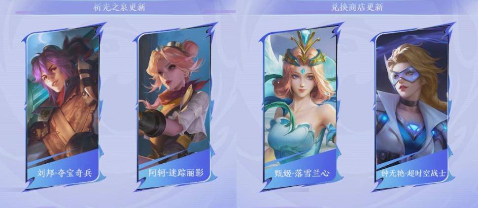 其次,祈光奖池将在11月1日上架刘邦的夺宝奇兵和阿轲的迷踪丽影,届时银河之约和星空之诺就会下架,想要的玩家赶紧去抽领。而战令币商店也将11月1日上架甄姬的落雪兰心和钟无艳的超时空战士,届时电玩高手和午后时光就会下架。