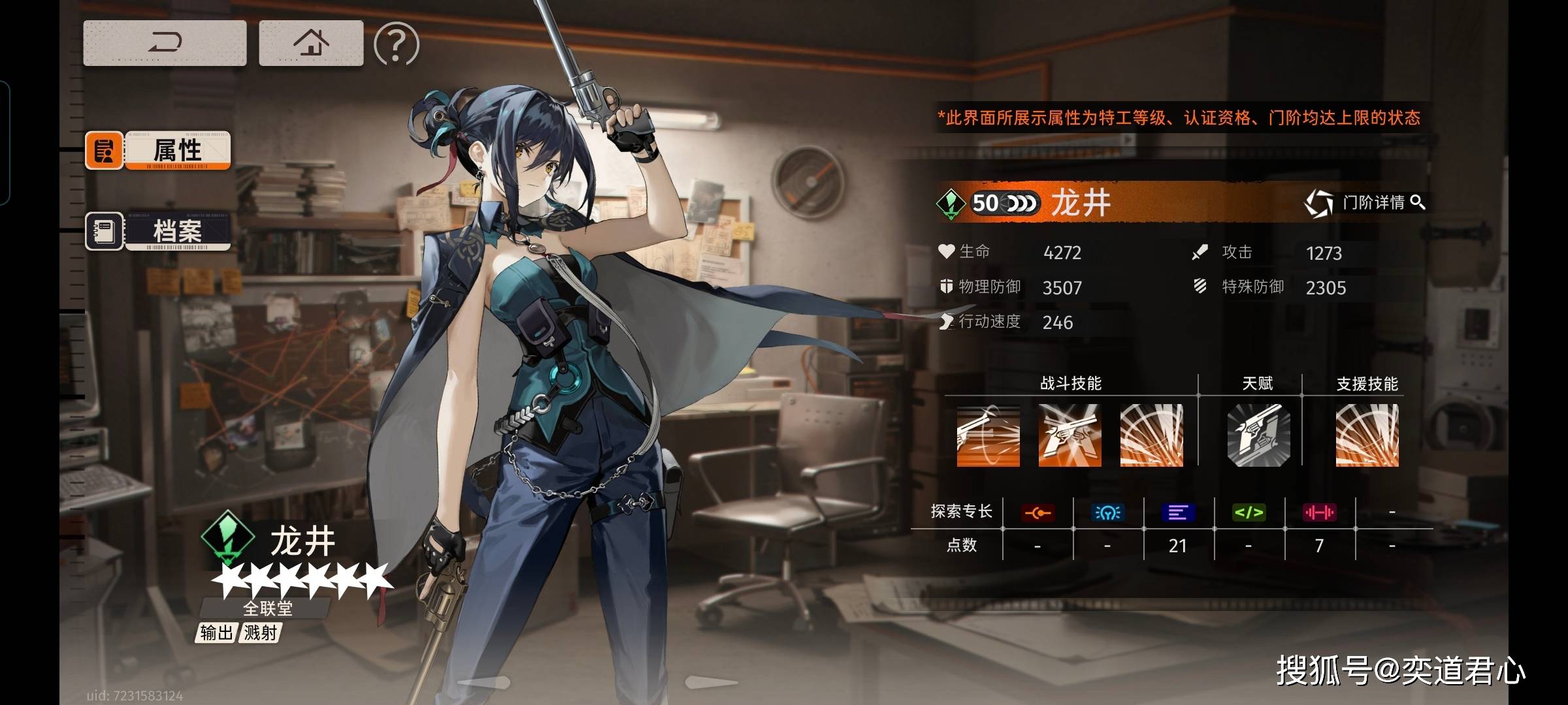 属于全联堂,兼顾了输出、削弱和援护功能,在掩护队友方面,相较于伞妹是有过之而无不及。其自身的物理防护基数,更是比伞妹要厚了一个档次!消毒药水的天赋,到后期会让她硬如坦克吧。