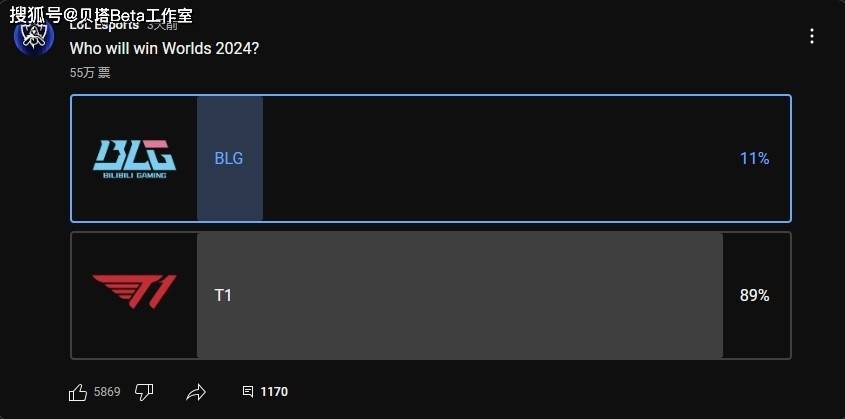 首先是LOL官方发布投票:谁会赢下2024年全球总决赛的冠军?一共有55万的网友参与,最终的结果是看好T1夺冠的超过89%,也就是49万人支持T1,看好BLG夺冠的只有11%,差不多是5万人。