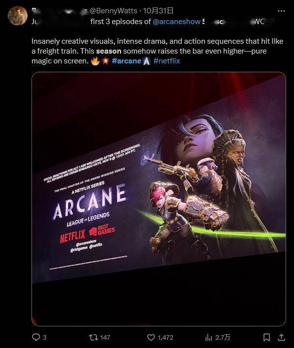 网飞 Netflix流媒体平台的《英雄联盟》衍生动画剧集《双城之战》在播出后受到了包括非玩家在内的所有人的好评。第二季即将开播,而有一些评测者已经看到了前三集,目前的首批反应非常积极。