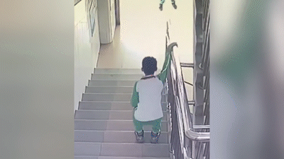 2023年11月,一段视频在网上传播,两名学生在楼梯跳下“玩跳远”。其中一名男孩从9级台阶一跃而下摔倒,头磕到了台阶上,男孩痛苦捂头躺地不起。