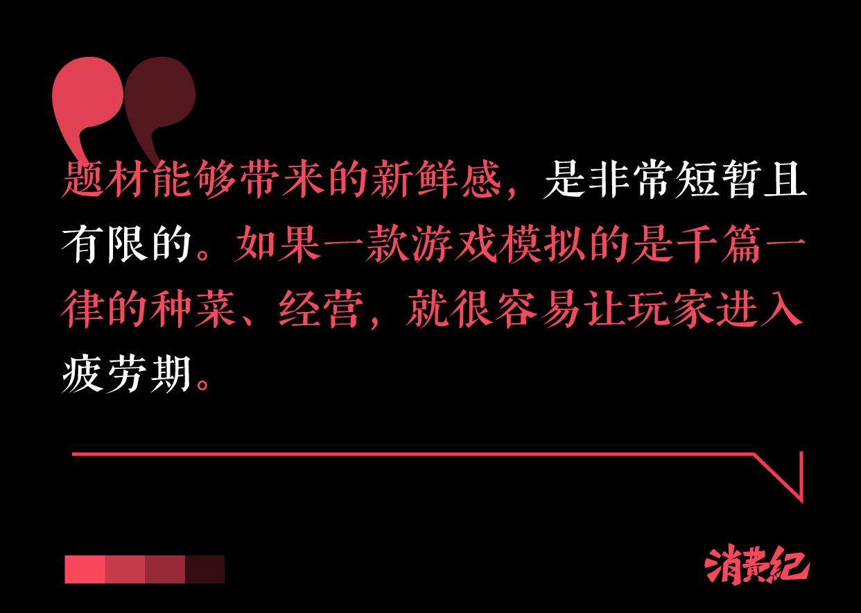 如果一款游戏模拟的是千篇一律的种菜、经营,就很容易让玩家进入疲劳期。毕竟,题材能够带来的新鲜感,是非常短暂且有限的。