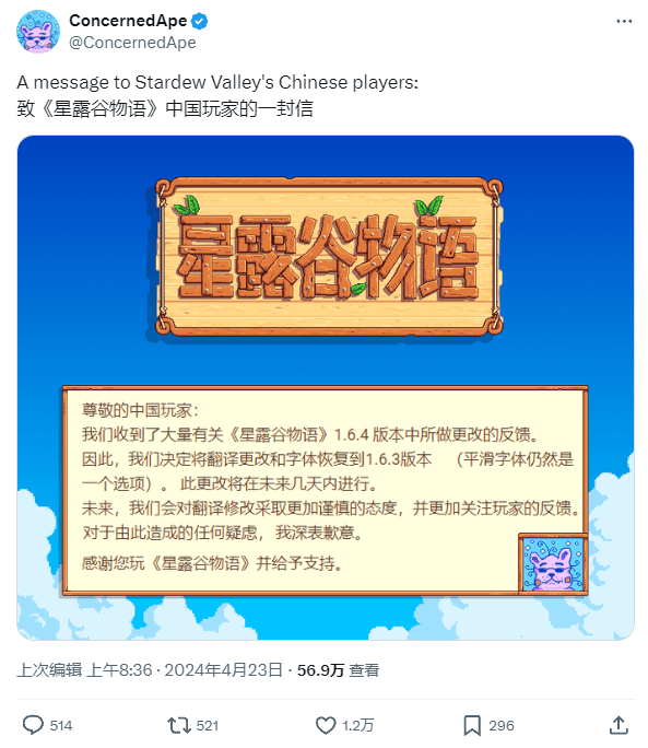 但在1.6.4版本中,对中文译文和字体所做的改动引发了不少国内玩家的不满,在当下国内的互联网环境中,无疑令这场“翻译风波”毫无疑问地被扩大化了。在Steam上持续了两天差评轰炸后,开发者ConcernedApe就表示“义无反顾站在玩家这一边”。