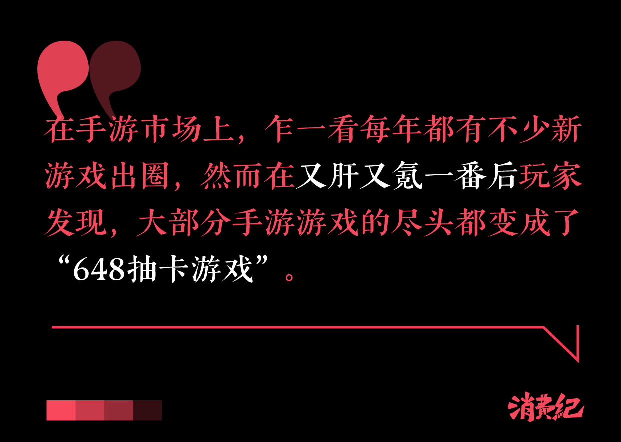 玩家们的感受则更加具体:在手游市场上,乍一看每年都有不少新游戏出圈,然而在又肝又氪一番后玩家发现,除了新设定和新名字,大部分手游游戏的尽头都变成了“648抽卡游戏”。