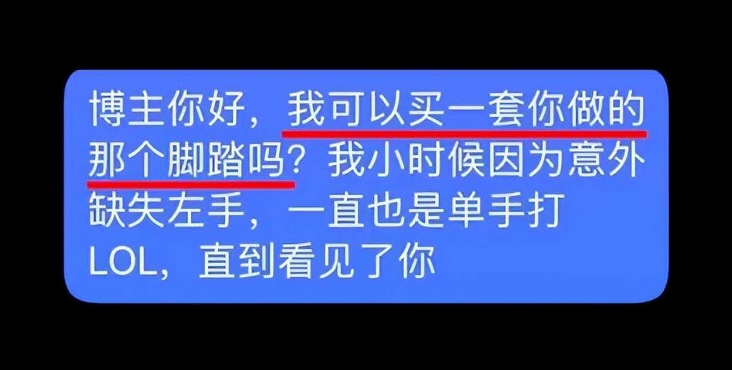作为一个英雄联盟内容创作者,墨轩为了曾开发过一个脚踏板DF按键。这项特殊的发明原本是为了整活,但却意外帮助到了需要它的人。在视频发布后,一位失去一只手臂的网友联系到了他,希望能够购买一套脚踏板。这样就能在单手操纵鼠标之余,用脚踏板释放技能。