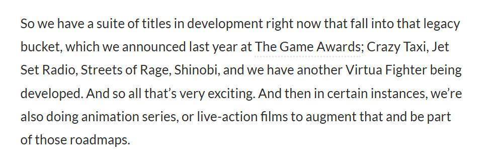 据世嘉全球跨媒体集团负责人 Justin Scarpone 近日在接受VGC采访时透露,世嘉旗下格斗游戏《VR战士》的一款新作正在开发当中。Scarpone 表示:“我们目前正在开发一系列去年在TGA上公布的传统游戏:包括《疯狂出租车》、《街头涂鸦》、《怒之铁拳》、《忍》,而且我们还有一款《VR战士》新作正在开发中。所有这一切都非常令人兴奋。在某些情况下,我们也会制作动画或真人电影来增强这些游戏系列,并使其成为规划的一部分。”