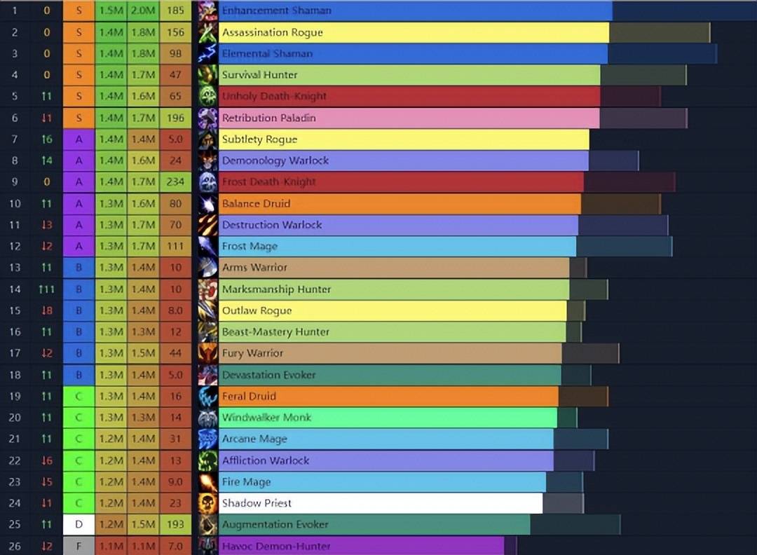 从目前排行榜来看,S级输出推荐为增强萨、刺杀贼、元素萨、生存猎、邪DK跟惩戒骑,这也是目前玩家人数最多的职业,建议还在集合石挣扎的老哥RE一个出来。A级可玩的职业是敏锐贼、恶魔术、冰DK、咕咕、毁灭术跟冰法。剩下的B跟C职业都是非车队不推荐玩的,属于是集合石保安。D级的唤魔师则因为独特的辅助机制被高层大神推崇,而DH则拿下全职业最低输出的“桂冠”。