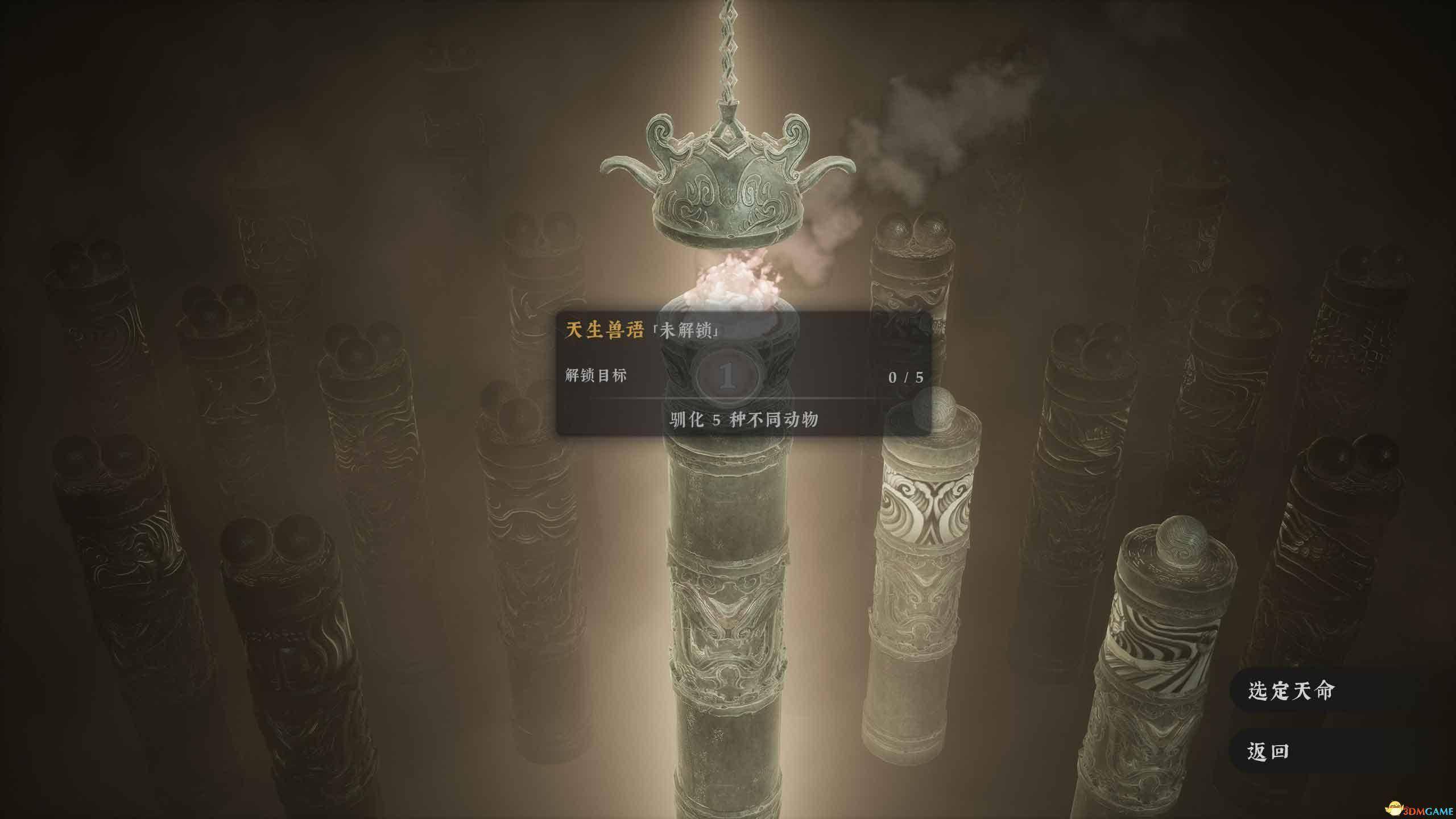 未解锁的天命会标注解锁条件,例如天生兽语要求驯化5种不同的动物。