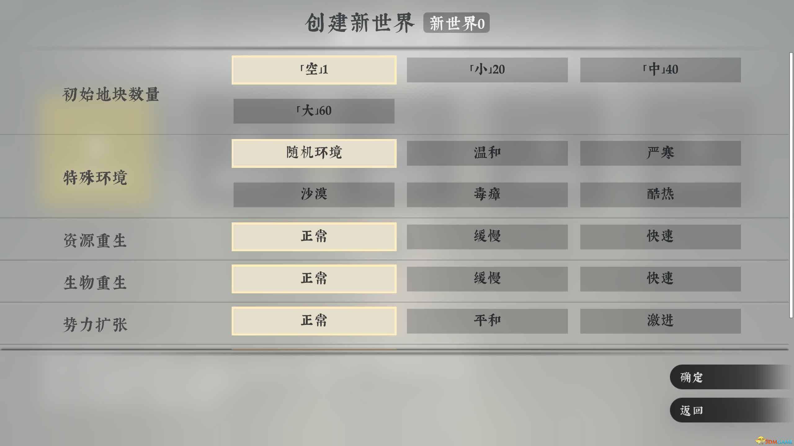 小世界可以选择初始大小,环境、资源\生物的重生速度,势力扩张手段。