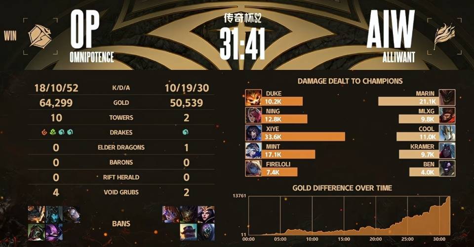 而在对阵OP的比赛里就更离谱,Mlxg前期被设计,打野直接落后两级,而且玩的还是个猴子!4级他想要换个资源,拯救一下自己前期发育,偷小龙没偷掉,反而送了大波,龙还没拿到,也让游戏早早没了悬念!中野差距直接养了个天肥狐狸,xiye在老头杯起飞拿下超神!Mlxg在赛后复盘看一眼,他表示这个前期就要换线,但是没换导致自己亏了,这也有点马后炮嘴硬了,不过他还是承认了这把自己主锅!只能说AIW这边力气都用在吵架上,根本没有用心对待BP和阵容,没有好好去复盘,本身就不好沟通,这样打下来Ben的奶粉钱太难了!不知道大家怎么看!