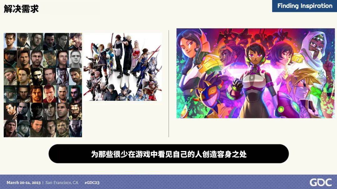 这深深启发了我,我想为那些很少在游戏中看见自己的人创造容身之处。我想创作一些角色,让他们和更多像我这样的人,能够说出“哦,她看起来像我的母亲,她仿佛是我的姐妹,我想在游戏中扮演这个角色,我想在那款游戏中看到自己,我想成为这个英雄。” 上图右侧是我的游戏角色阵容,包含了一些黑人角色,一对拉丁裔夫妻。我会尽力从成长过程中认识的不同文化背景的人,与那些在游戏中很少找到自己的化身的人那里汲取灵感。